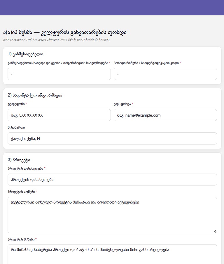 • განაცხადის შევსება შეუძლია ნებისმიერ საქართველოს მოქალაქეს ან საქართველოში რეგისტრირებულ ორგანიზაციას.
